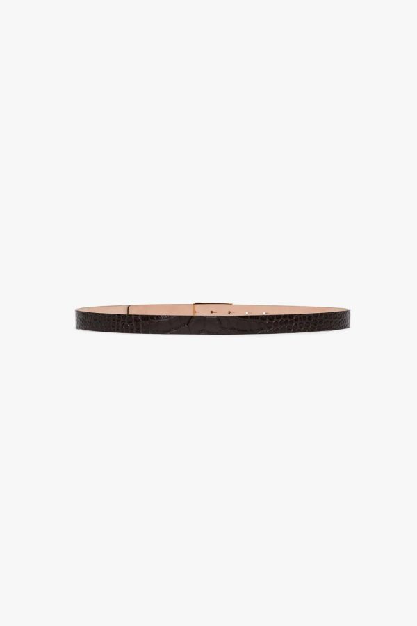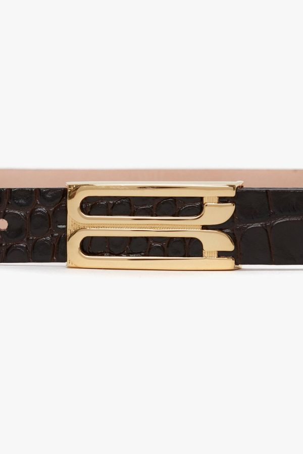 Exquisitely made from tactile croc-embossed calf leather in a creamy shade of Espresso, the Dorian Belt will add a discrete finishing touch to tailored separates and feminine dresses. Embellished with refined gold hardware, it reflects the house’s signature polish.