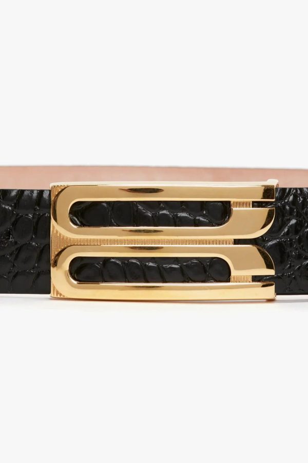 Ideal for adding a directional talking point to tailored separates and feminine midi dresses, the utilitarian-inspired Jumbo Dorian Belt is reimagined in sophisticated Black for the new season. Crafted from croc-embossed calf leather and embellished with luxury gold hardware for an elevated finish, it is a signature piece in the house’s leather goods archive.
