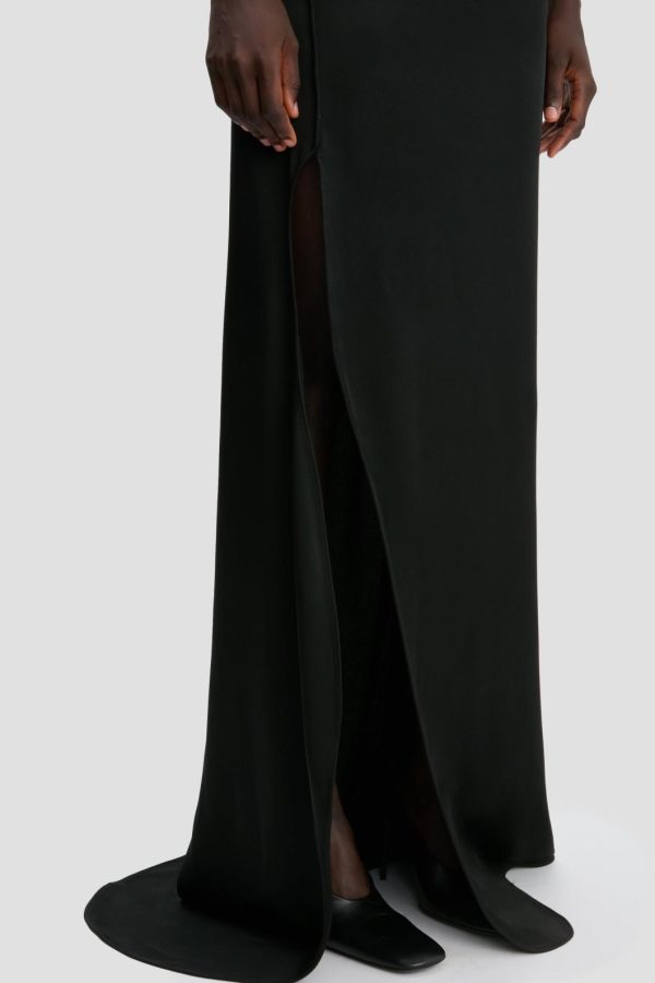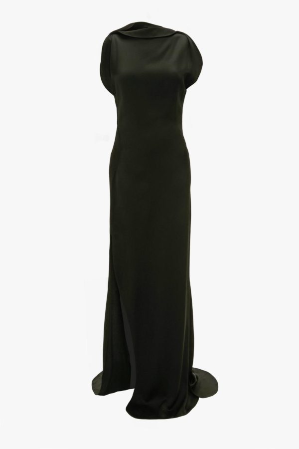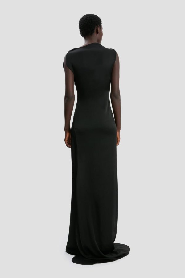 Experience dramatic sophistication with this stunning floor-length gown featuring an artfully draped neckline accented by elegant piping that flows seamlessly around the armholes and down to the skirt hem. Crafted from premium crepe back satin that moves with effortless grace, this sleeveless dress makes a powerful statement with its distinctive curved seam detail along the right side and striking train.