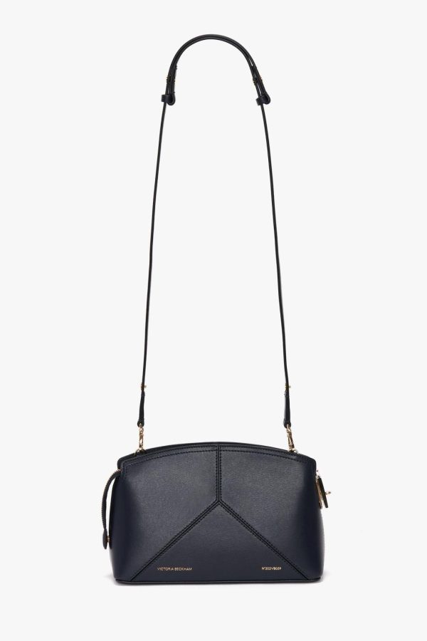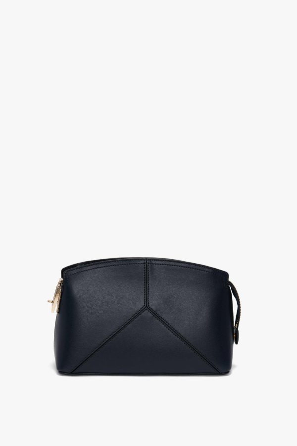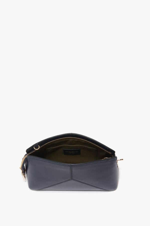 The latest addition to the house’s leather goods edit, this luxuriously textured clutch bag in refined Navy is a favourite of Victoria’s. Featuring a structured silhouette with an elegant curved top, it has several notable features, including a branded padlock serving as zipper and closure, a snap button at one side to hold the zip tail in place and leather panels stitched to form a V shape. A flat internal pocket ensures secure storage of smaller items.