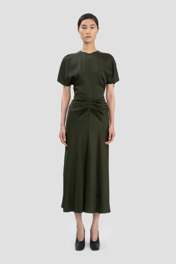 Experience sophisticated elegance with this gathered waist midi dress that delivers a polished, professional look. Crafted in a rich dark olive hue, this dress features a beautifully contoured waist and hip-hugging silhouette with a gracefully fluid skirt that extends slightly longer at the back for a dramatic effect. The pleated detail at the waist creates a sensual focal point, while the elegant V-shape waist seam at the back is artfully mirrored by the subtle V-shape neckline, creating a harmonious design.