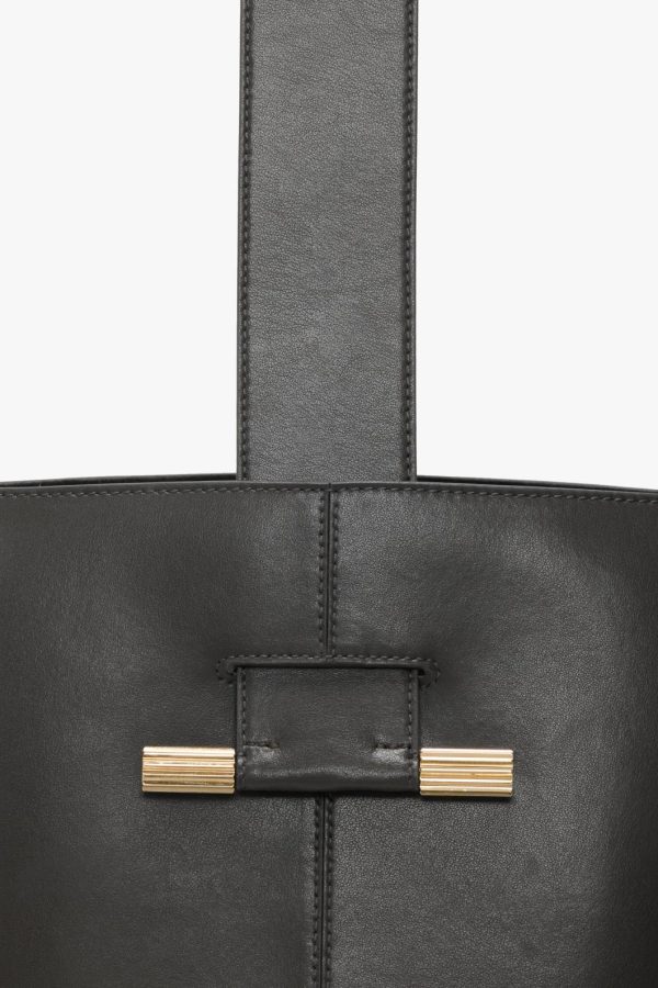 Meet the iconic Dia Bucket Bag, crafted from luxurious smooth black leather that perfectly balances masculine-inspired details with feminine curves. This sophisticated piece combines practical functionality with polished design, featuring distinctive cufflink-inspired gold hardware and a beautifully rounded silhouette. The versatile shoulder strap and organized interior with flat pocket make it perfect for everyday elegance, while the premium suede lining adds a touch of refined luxury.