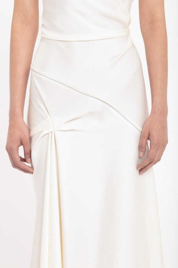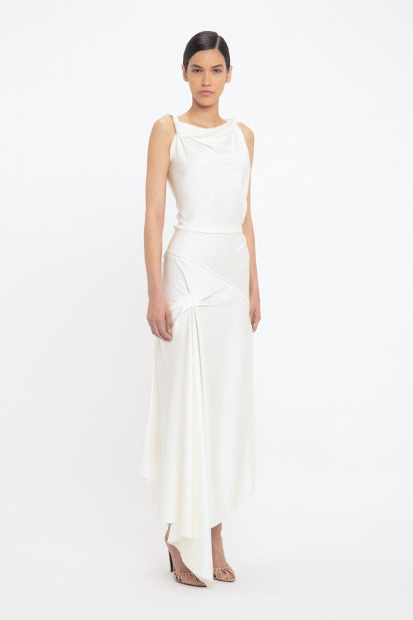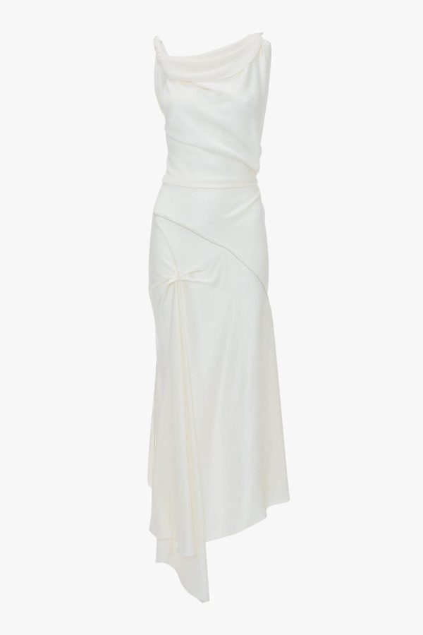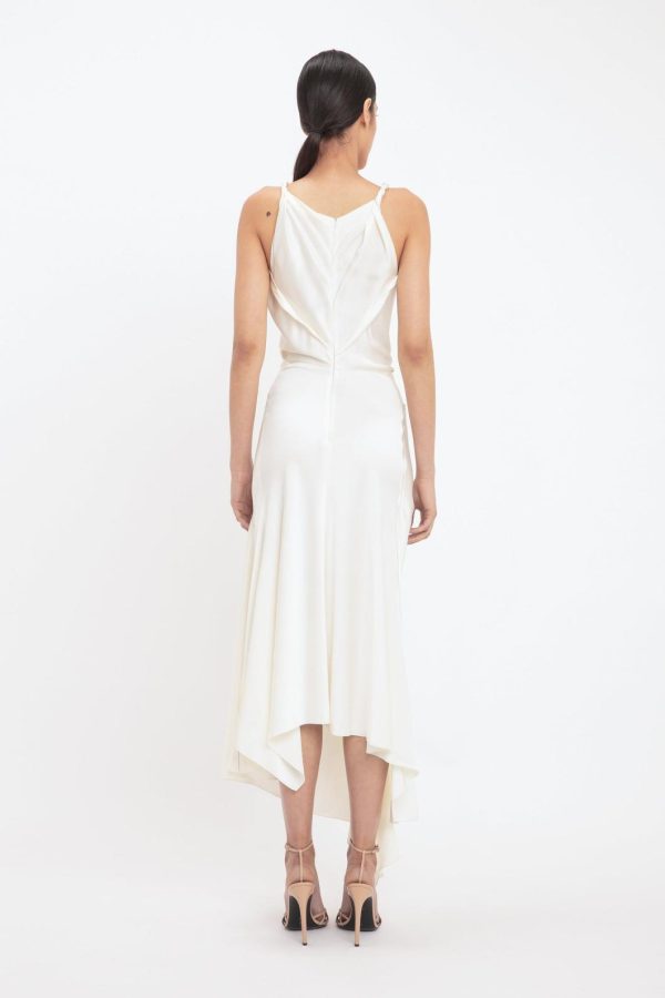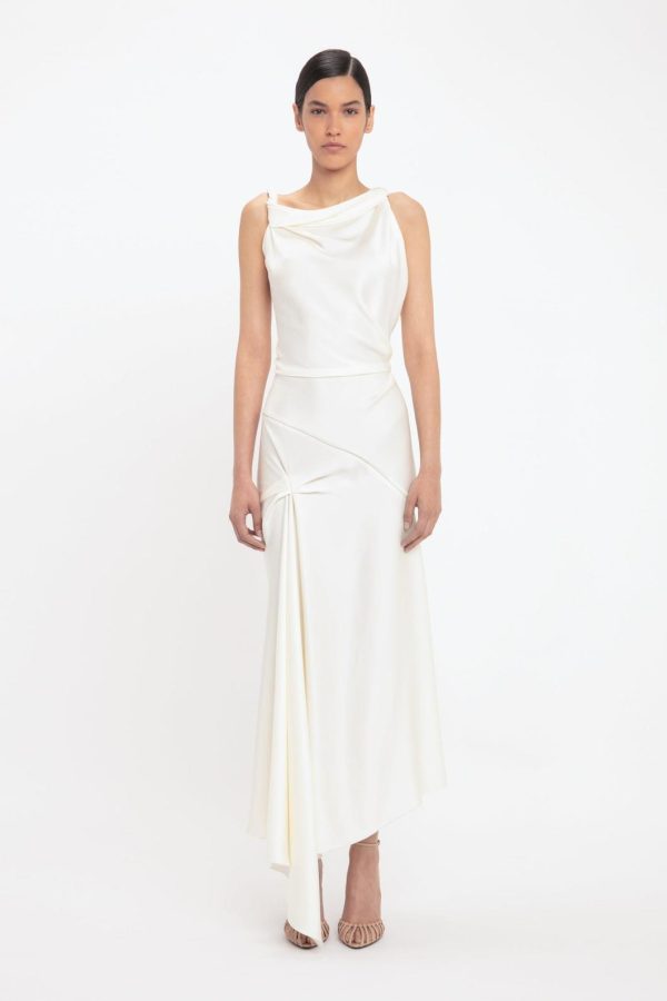 Crafted in luxurious crepe back satin and presented in a nostalgic shade of ivory, the Asymmetric Draped Midi Dress has a modern romance. Tactile features such as a twisted shoulder detail and elegant drape at the front of the skirt add sensuous points of difference, while an asymmetric hemline brings a directional edge. Exposed seams and contrast topstitching complete the look.