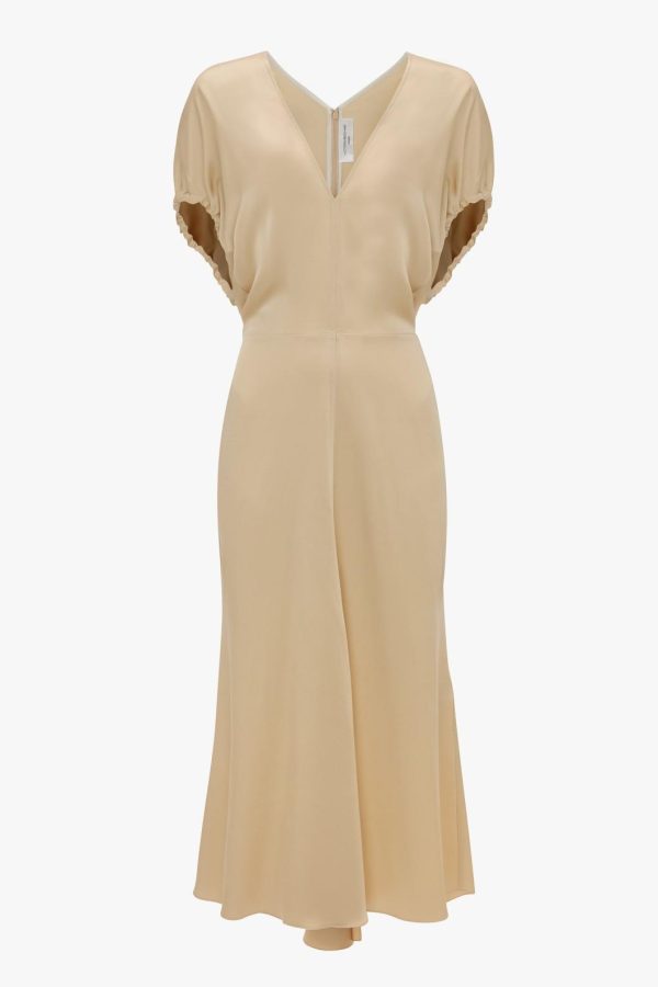 Characterised by short full sleeves with directional rope edging, the Blouson Detail Midi Dress has a front V neckline and a longer-length hemline at the back. Contrasting internal binding at the neckline adds visual interest, while a fitted waist and fluid skirt ensure a flattering silhouette. Reimagined in Macadamia, it is an effortlessly elegant piece.