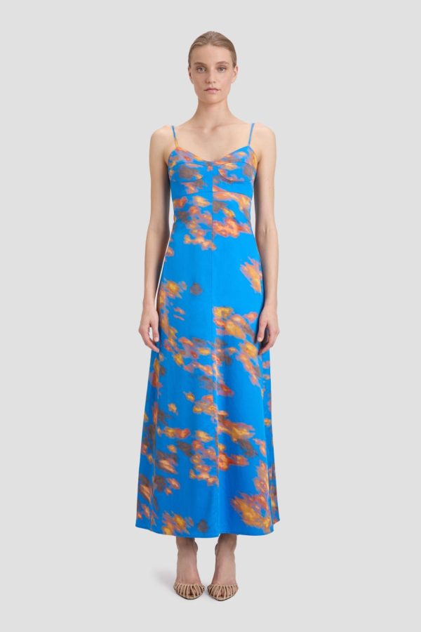 Made from 100% organic cotton with bodice lining, the Cami Fit And Flare Midi Dress has a playful sophistication. Visible seams and tonal topstitching add interest, while a contrasting red topstitch at the side seams makes an attractive design feature. A back V-shaped waist seam adds definition to the silhouette and the Blue Abstract floral print brings an energetic point of difference.
