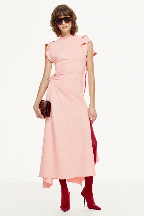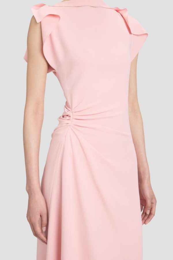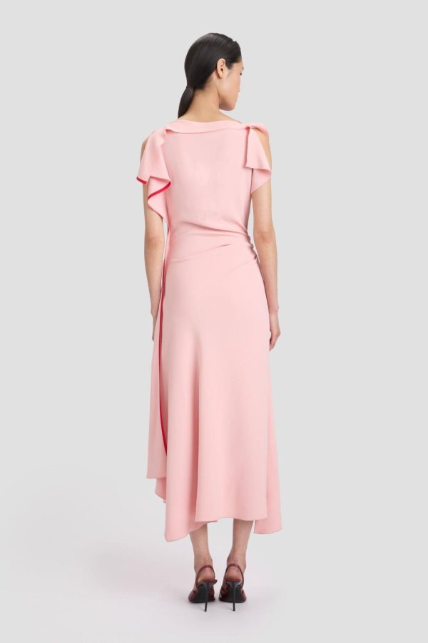 A delicate shade of Antique Pink brings a romantic sensibility to the Drape Sleeve Midi Dress. Tactile drape detailing at the front neckline and shoulder bring contemporary flair, while a pleated feature at the waistline creates a figure-flattering finish. Side seam splits and an asymmetric hem add fluidity to the silhouette and contrasting red binding adds an attractive design detail.