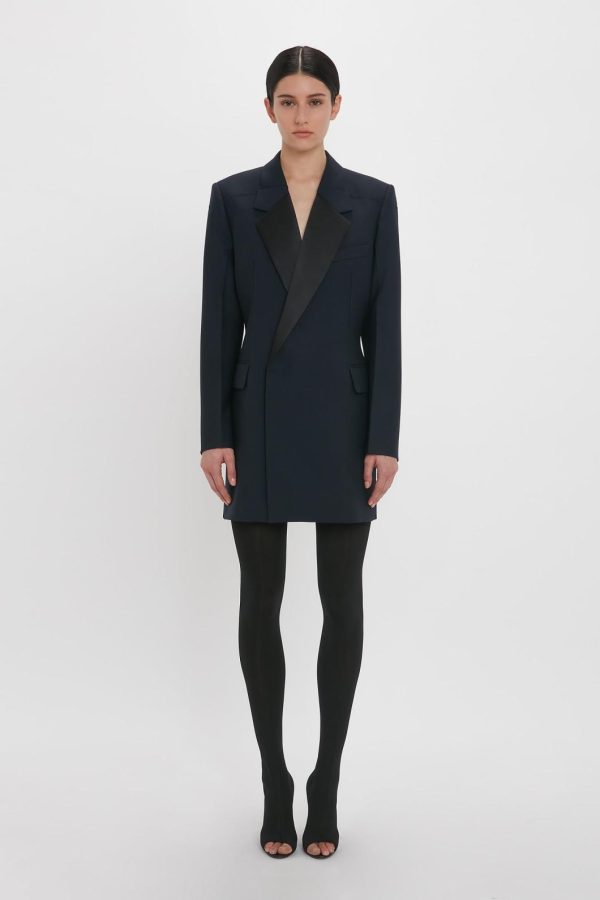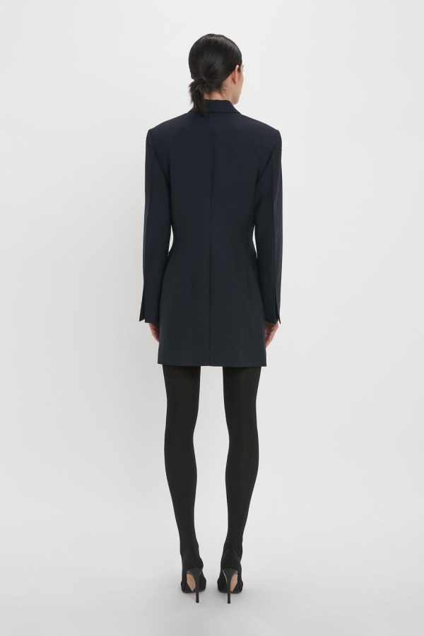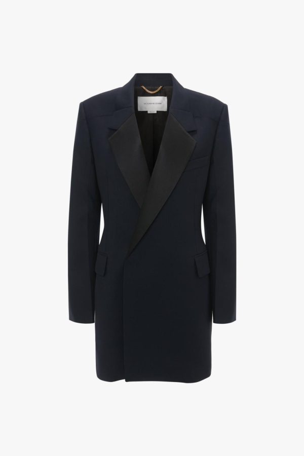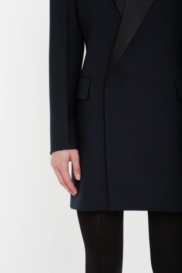 Masculine-inspired tailoring is a hallmark of the Victoria Beckham brand and the Fold Shoulder Detail Dress takes the traditional suit jacket and reimagines it as contemporary evening wear. Presented exclusively in refined Navy for the new season, it has a double-breasted cut for a gently defined waist and an otherwise relaxed fit. Elevated design details include an exposed seam detail across the front and back upper, satin lapels and front flap pockets.