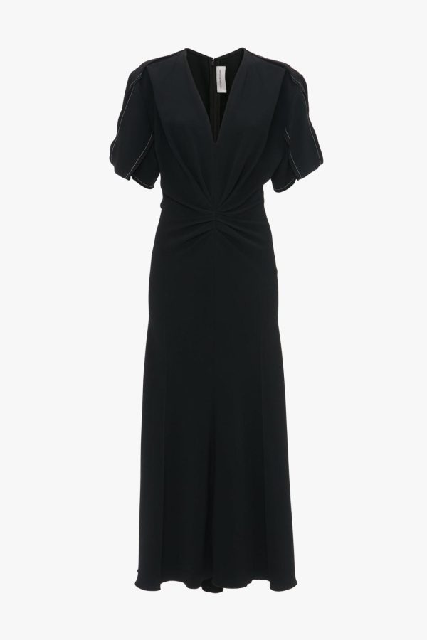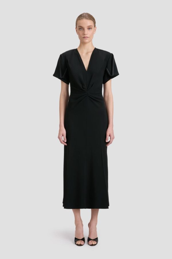 The Gathered V-Neck Midi Dress is crafted from a figure-flattering stretch fabric. A soft curved neckline, waist-defining pleat detail and longer-length hem at the back create a pared-back but polished silhouette, while exposed seams and contrasting topstitching imbue this piece with a contemporary edge.