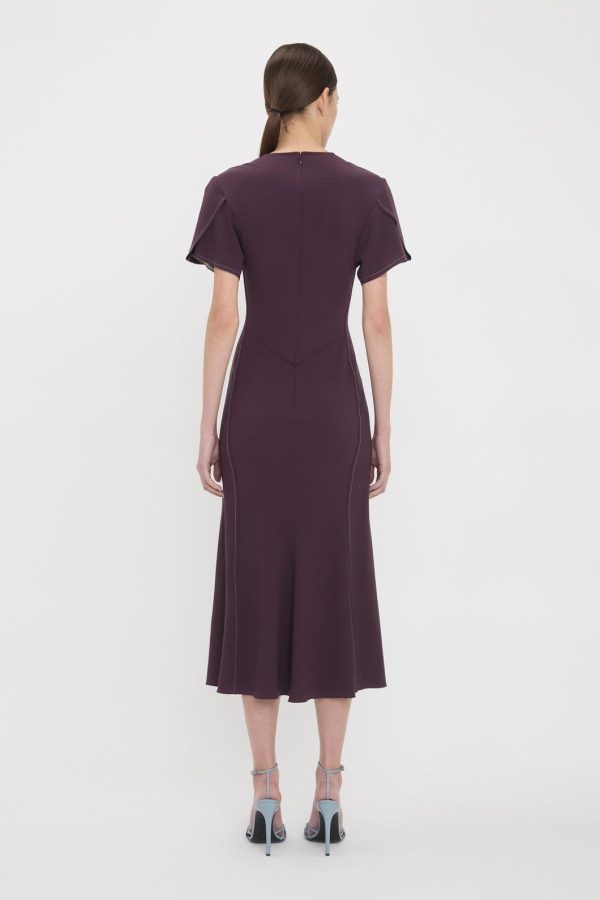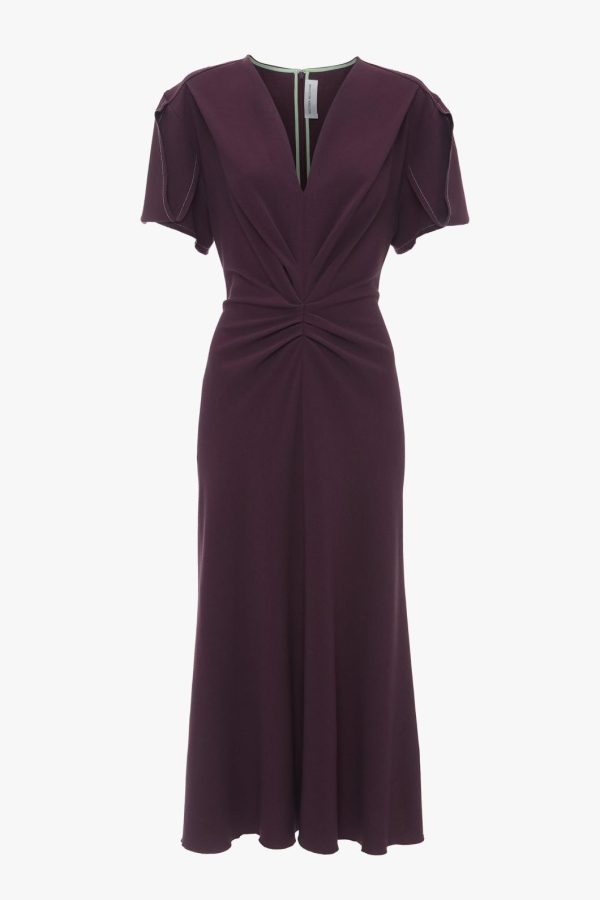 Reimagined in luxurious Fig, the house’s signature Gathered V-Neck Midi Dress embodies effortless elegance. Shaped at the waist but with a relaxed fit through the bodice and gently flared skirt, it has a refined but informal appeal. Pleat details at the front waist and front shoulder bring tactility and definition to the silhouette, while exposed seams, contrast topstitching and an asymmetric hemline at the back reflect the brand’s uncompromising attention to detail.