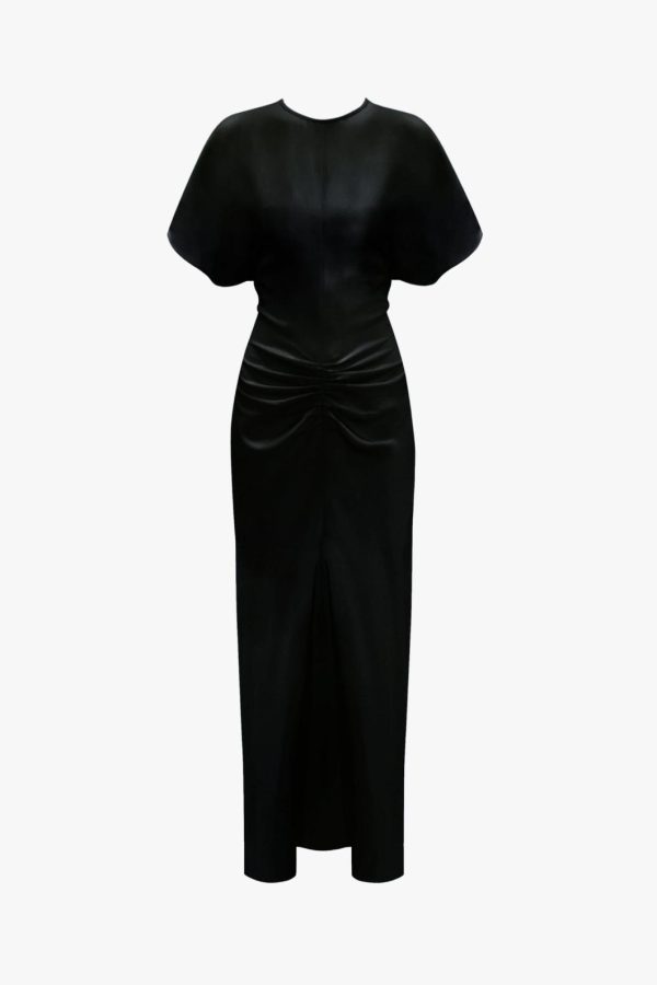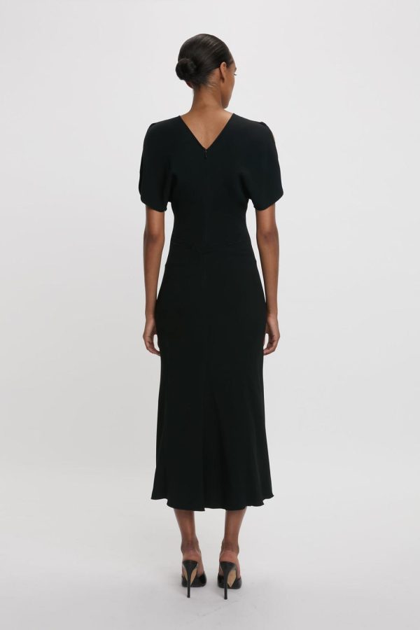 Reimagined in universally appealing Black, this elegant Gathered Waist Midi Dress has a gathered front, tulip sleeve detail and slight V-neck at the back. Immaculately cut to accentuate the waist in a classic fit-and-flare silhouette, the Gathered Waist Midi Dress is rooted in femininity and exudes a modern refinement.