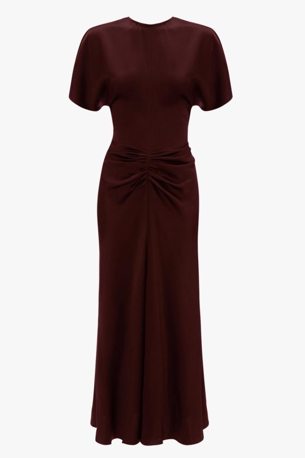 The Gathered Waist Midi Dress delivers a professional and polished aesthetic. Presented in rich Merlot, it has a waist and hip-hugging cut and a fluid skirt with a longer-length hem at the back. A pleated detail at the waist adds a sensuous point of interest, while a V-shape waist seam at the back is mirrored by a subtle V-shape neckline, also at the back.