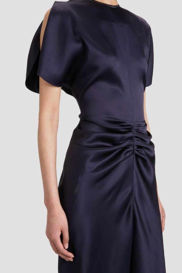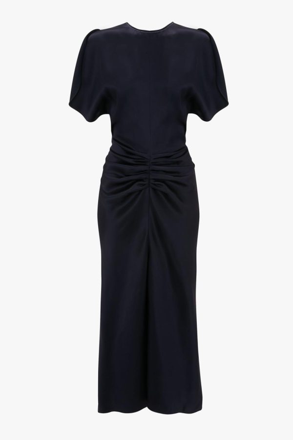 Shaped at the waistline with a more relaxed fit through the bodice, the Gathered Waist Midi Dress has a flattering and informal silhouette. Pleat details at the front waist and shoulders bring texture, while hard press details through the skirt and back shoulder add subtle structure. Presented in versatile Midnight, it features elevated finishing touches such as exposed seams, a contrasting topstitch and a longer-length hemline at the back.