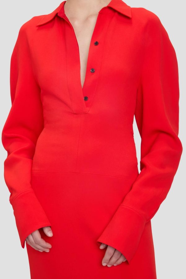 Blending masculine and feminine references, the Long Sleeve Polo Collar Midi Dress has a traditional collar and concealed front placket balanced by a fluid skirt with longer-length hem at the back. Raglan sleeves bring a laid-back nonchalance to the look, while a contrasting topstitch adds an elevated finishing touch. Presented in vivid Tomato Red, it makes a confident statement.