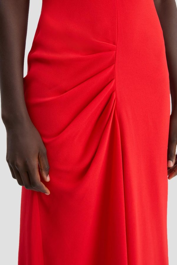 Crafted from crepe back satin, this wear-anywhere midi dress is distinguished by a refined rouleaux detail at the sleeves and neckline. Fitted at the bodice, waist and hip, with a pleat detail skirt and asymmetric hemline, it has a sophistication rooted in modern femininity. Elegant draped sleeves and a V neckline complete the look, while the vibrant shade of Cayenne makes a confident statement.