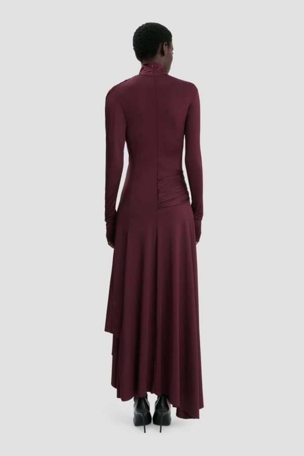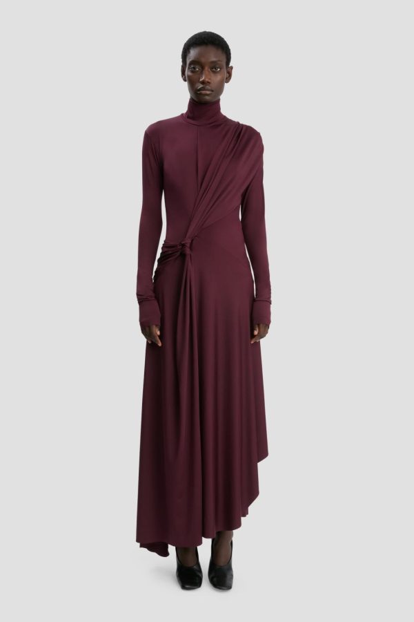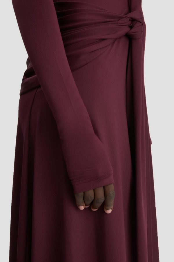 A twisted drape stretching from the left shoulder to the right hip brings a provocative point of difference to the Twist Detail High Neck dress. Crafted from stretch jersey and presented in rich Merlot, it has modest long sleeves, a demure high neckline and a directional asymmetric hemline. It exudes the house’s signature modest refinement.