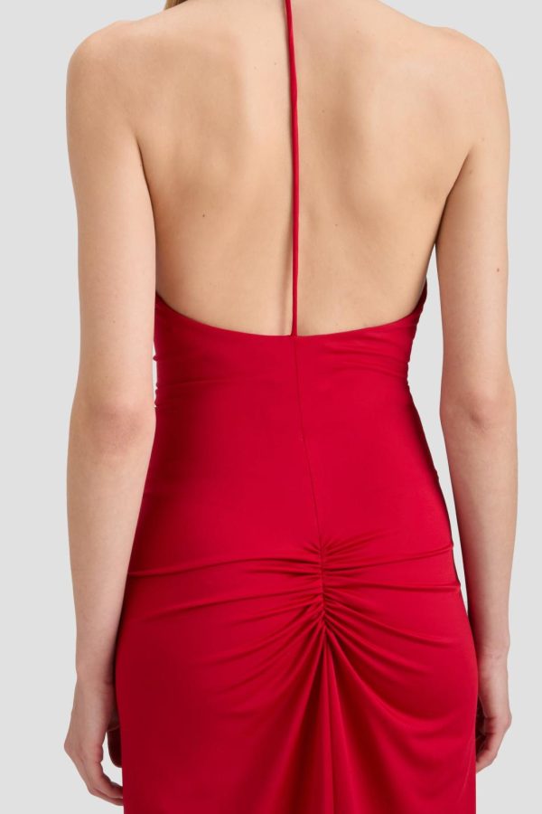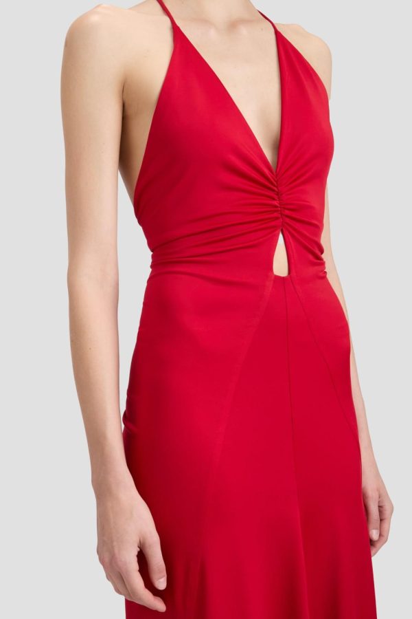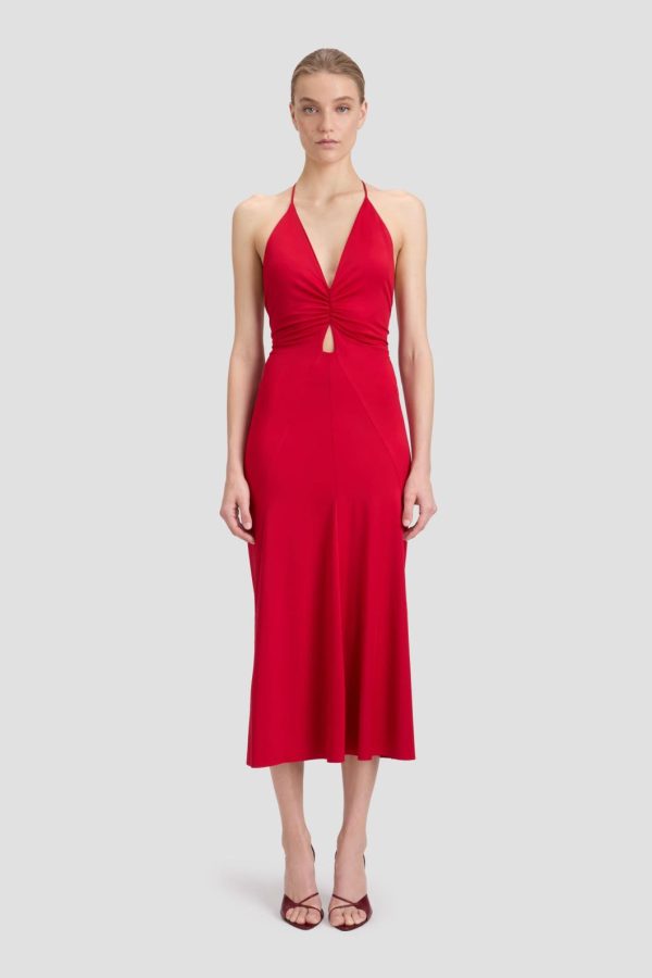 Reimagined in vibrant Rose, the V-Neck Ruched Cami Midi Dress is a confident proposition for the new season. Characterised by a tactile gathered front bodice and a playful cut-out at the front waist, it embodies the house’s sexy sophistication. Crafted in stretch jersey with a fitted bodice and full skirt, it is finished with a provocatively low back and single centre strap.