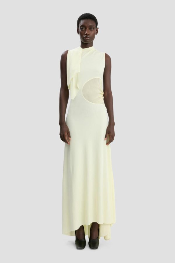 Make a stunning statement this season with this runway-inspired sleeveless draped panel dress featuring a dramatic oversized cut-out on the right bodice. Expertly crafted from fluid jersey with a graceful floor-length silhouette, this dress showcases an elegant draped neckline with attached scarf, sophisticated pleat detailing at the back waist, and contrasting georgette panels with crisp piped trim. The asymmetric hemline creates captivating movement, while the soft Frosted Yellow hue offers a modern contrast to the dress’s bold architectural silhouette.