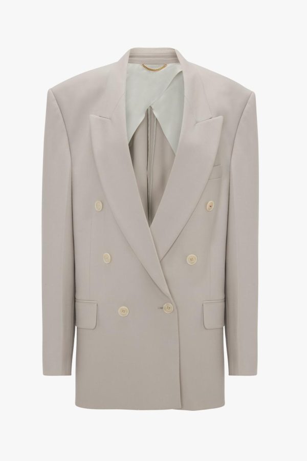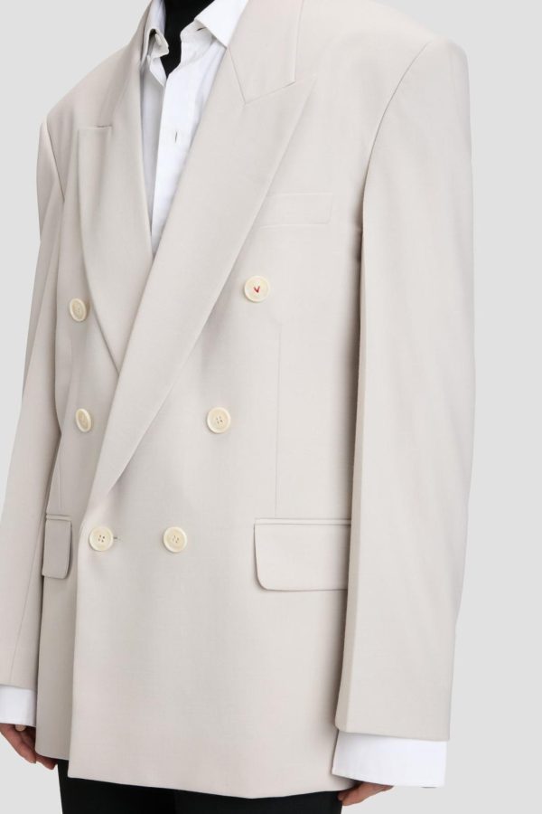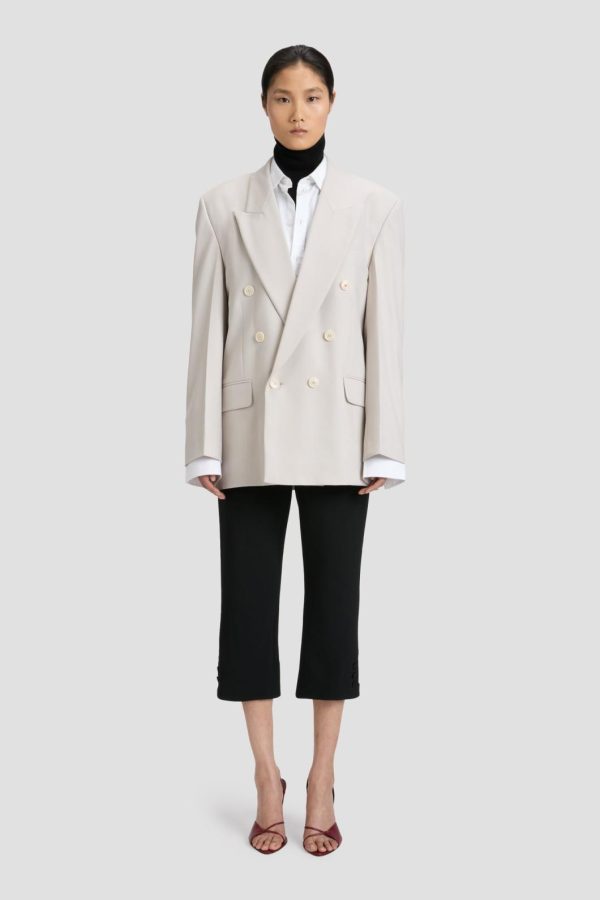 Classic menswear tailoring is reimagined with the house’s signature attention to detail in the Relaxed Double Breasted Jacket. An oversized fit and double-breasted fastening are the defining features, complemented by an elasticated cinch detail at the back waistline, a chain detail at the back of the neck and a single contrasting red stitched button at the front and at either cuff. A subdued shade of Pumice balances the boyish undertone with a feminine energy.
