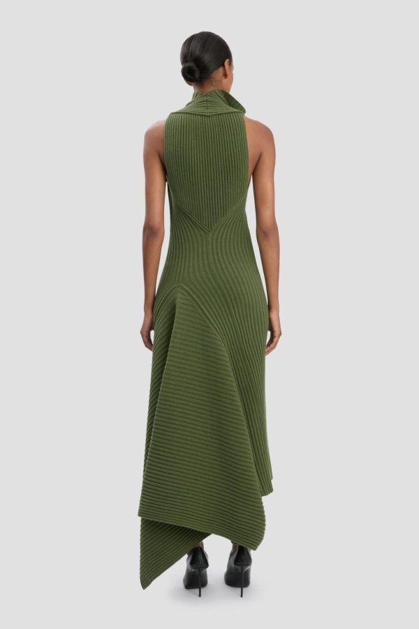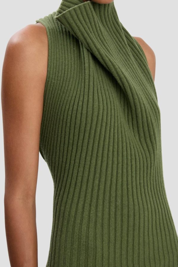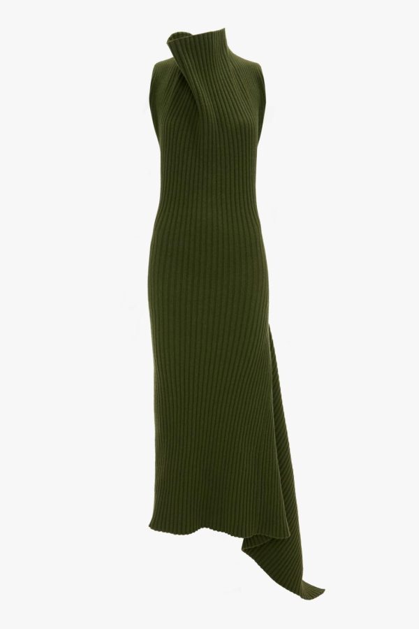 Exuding an understated sophistication, the Draped Sleeveless Rib Midi Dress is crafted from a lambswool blend and designed with a chunky ribbed stitch for a tactile finish. An architectural cowl-front neck and an asymmetric hemline add energy to an otherwise sleek silhouette, while the subdued shade of Oregano gives it wear-anywhere appeal.