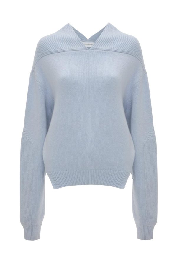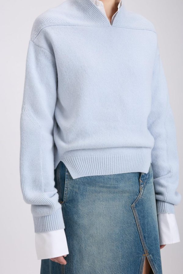 With a relaxed fit and ribbed knit patches on each sleeve, the V-Neck Yoke Detail Jumper has a boyish undertone, which is beautifully counteracted by the delicate shade of Delphinium. Side split hems imbue the silhouette with fresh energy and a branded embroidered tape at the back of the neck adds an elevated fishing touch.