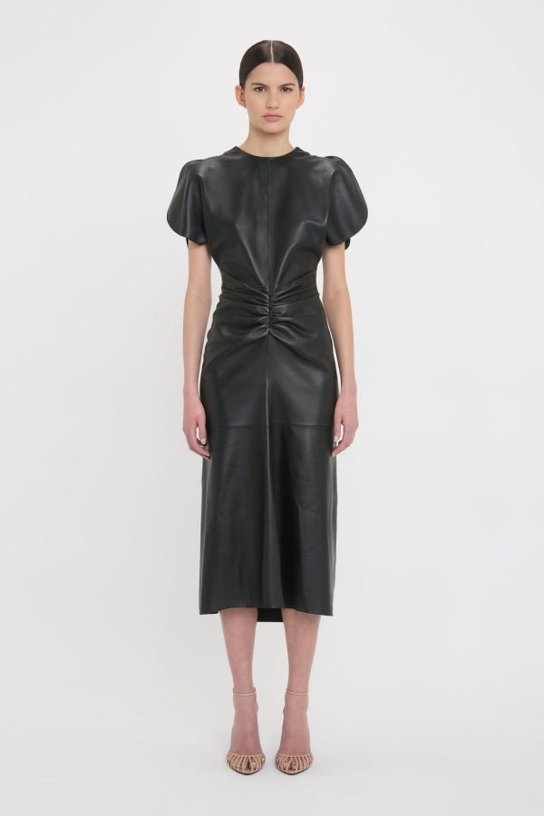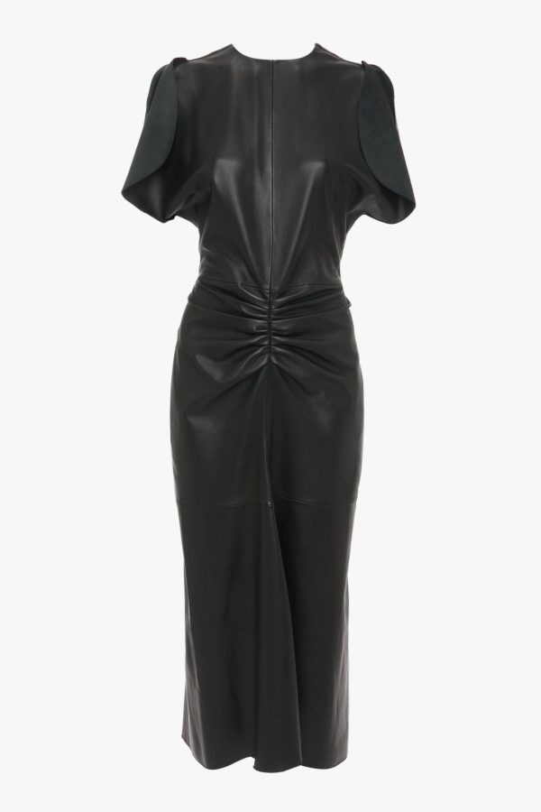 Supple nappa leather redefines the house’s signature Gathered Waist Midi Dress for SS25. Feminine detailing such as pleats at the waist, a flattering V-shaped seam at the back and graduated hemline create a contemporary contrast with the utilitarian fabric. Exposed seams and contrast topstitching details add to the directional aesthetic.