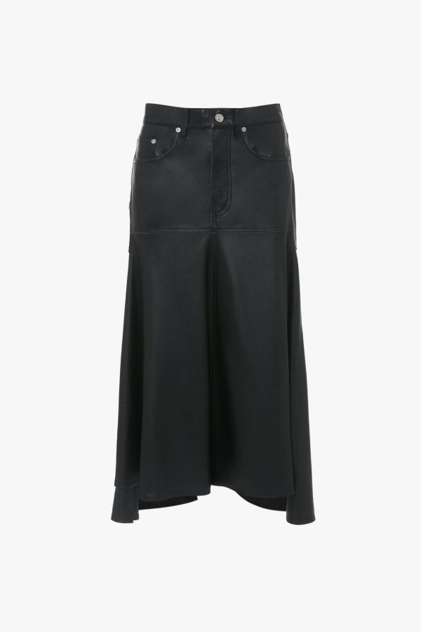 Supple lamb leather brings a utilitarian twist to the sophisticated Panelled Leather Flare Skirt. Fitted at the waist and hips with a flared hem, it has raw edge panels with topstitching, front and coin pockets with rivets and back patch pockets. Finished with a back slit in the skirt, it has a contemporary wear-enywhere elegance.