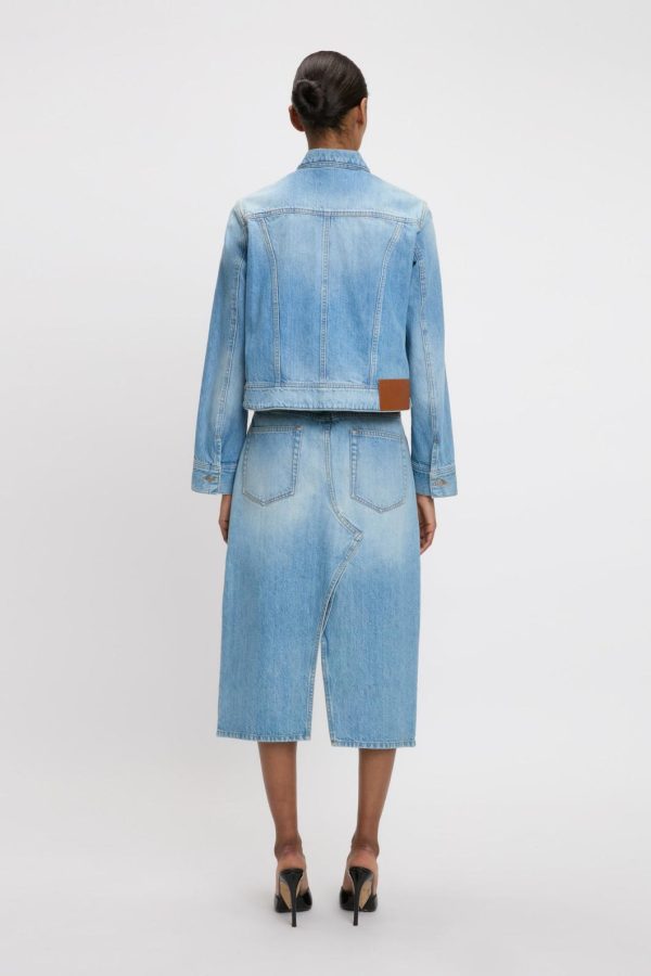 Expertly crafted from premium twill non-stretch denim for a perfect true-to-size fit, this Light Blue Wash Denim Jacket features a flattering fitted silhouette and contemporary cropped length that puts a feminine spin on the classic utilitarian favorite. The front yoke and dart detailing create beautiful shape definition while the elegant pleated back adds subtle volume and movement. Finished with sophisticated side tabs and a signature branded denim shank button for that perfect designer touch.