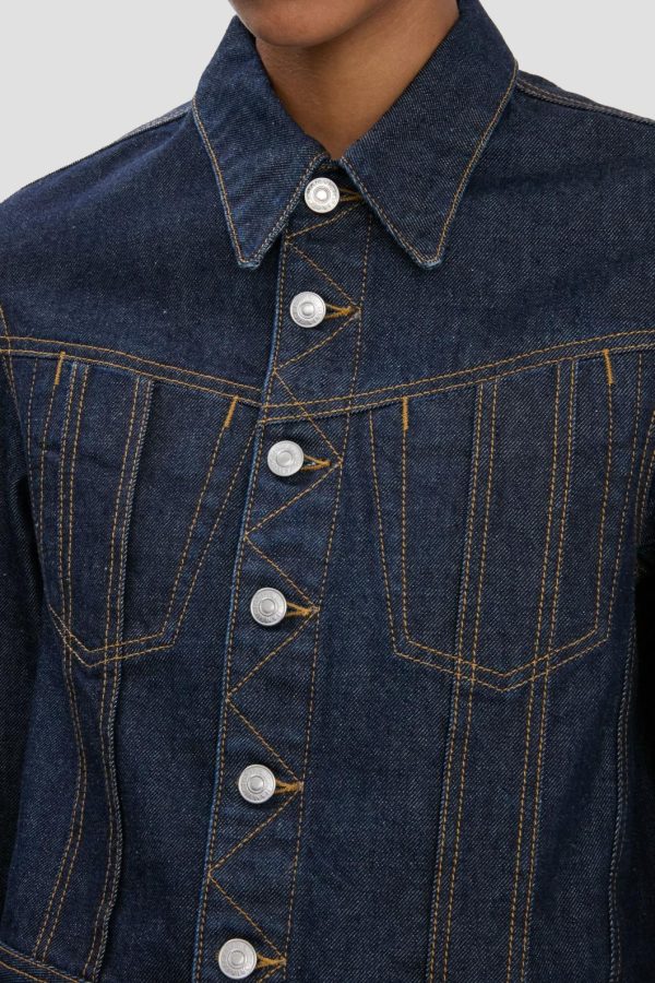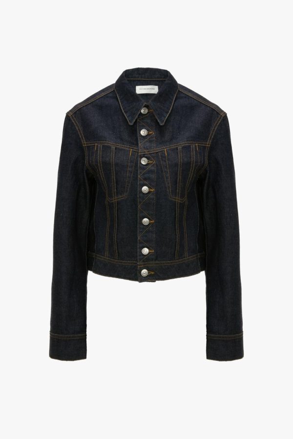 The Denim Jacket in Light Rinse features a contemporary silhouette that plays with proportions, offering extra-long sleeves paired with a fashion-forward cropped hemline. Designed with a sleek, tailored fit, it showcases a classic collar and front placket fastening, premium branded denim shank buttons, and distinctive tobacco topstitching. Crafted from a non-stretch, mid-weight denim, this piece masterfully blends masculine and feminine elements for a modern twist on a timeless wardrobe essential.