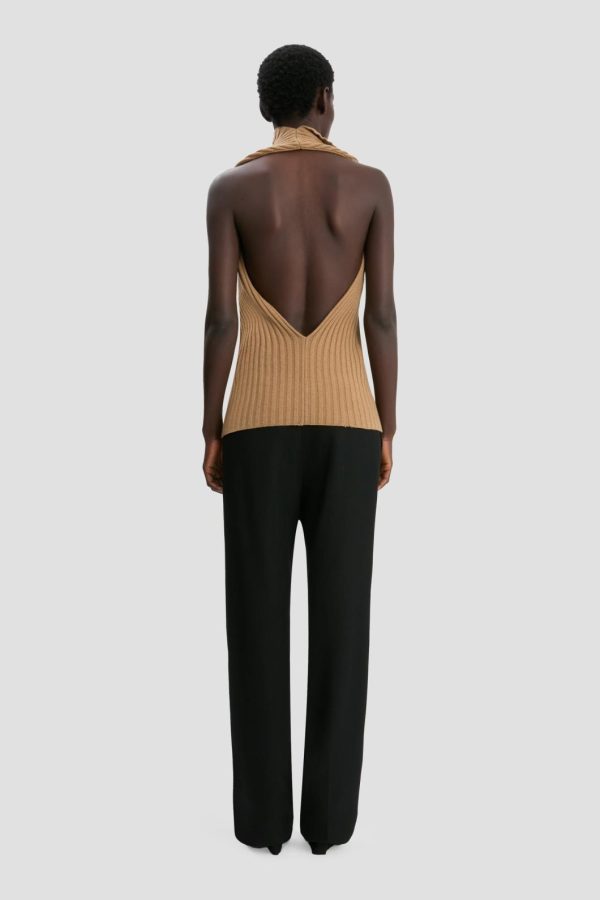 A standout piece from the autumn/winter runway, the Draped Sleeveless Rib Top has an architectural cowl-neck front for a directional take on seasonal knitwear. Crafted from a lambswool blend and designed with a chunky ribbed stitch, it has a tactility that creates a contemporary contrast with the unexpected open-back design. Presented in Dark Camel, it is a sensuous and sophisticated proposition for the new season.
