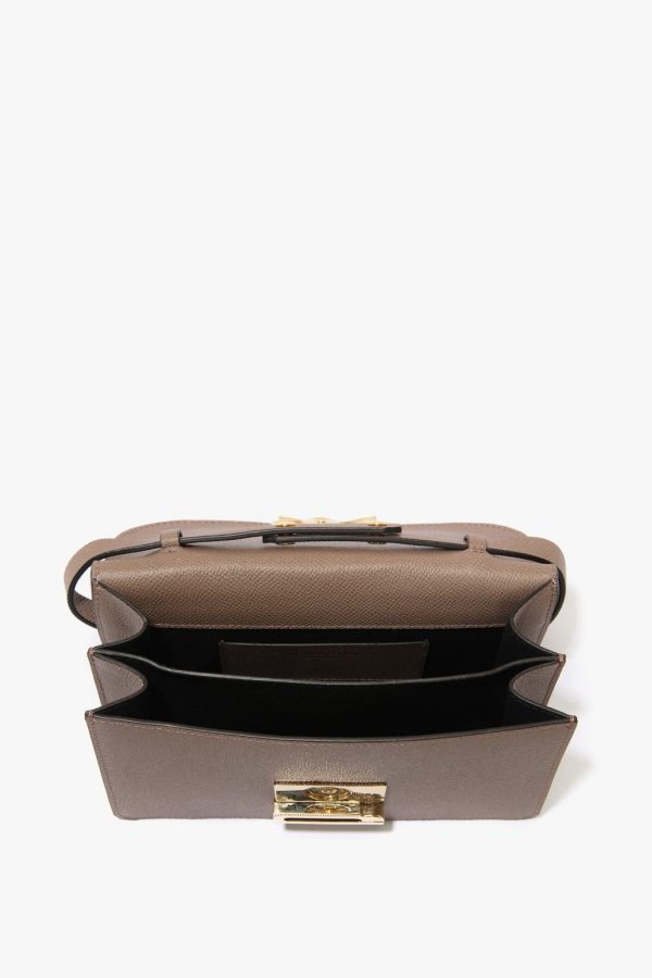 A new silhouette to the Victoria Beckham leather goods edit, the Mini Dorian Bag in dove grey is exquisitely crafted in Italy from textured calf leather and microsuede lining. It has a removable ‘smart strap’ with snap buttons for versatile styling as a shoulder, crossbody or clutch bag and features the house’s signature gold branding, which includes the discretely stamped address of Victoria’s London studio (N.202) followed by a unique serial number.