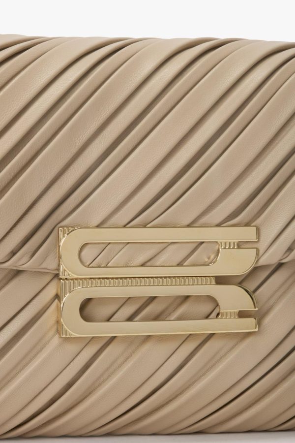 New to the Dorian leather goods family, which draws inspiration from men’s leather goods, the Soft Dorian Bag in Sand pleated leather is defined by its tactile pleated nappa leather body. An adjustable strap allows for versatile styling as a shoulder or crossbody bag, while the house’s signature gold branding with Victoria Beckham logo, unique serial number and B Frame split lock adds polish. An internal triple compartment allows for secure storage.