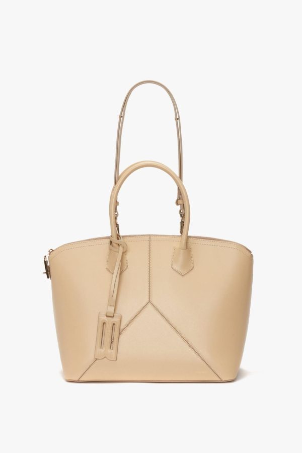 A versatile hold-all, this generously sized Victoria Bag has a structured body for protected storage and an internal flat pocket for security. Notable features include top handles and an adjustable and removable strap, an engraved zip puller and padlock closure, a snap button to hold the zip tape in place and a removable leather debossed charm. Leather panels stitched to form the house’s signature V shape add visual interest, while the fresh shade of Sesame imbues it with a distinctive personality.