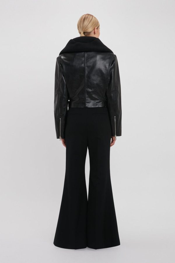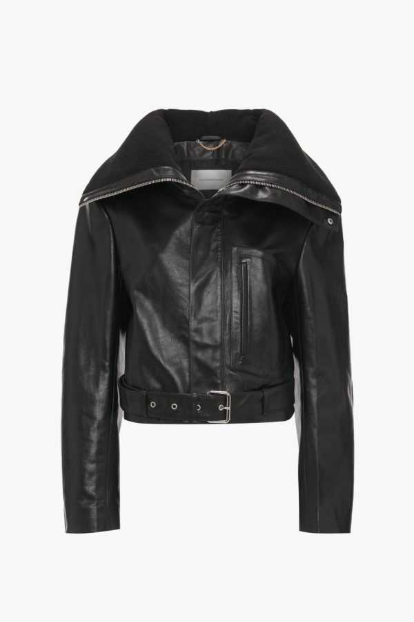 This fashion-forward cropped silhouette features an extra-wide collar and premium calf-skin construction that transforms the classic biker jacket into a statement outerwear piece. Selected by Victoria herself from the AW24 runway collection, this jacket delivers sophisticated edge with its metal front and cuff zippers, adjustable half-belt hem, and authentic leather elbow patches. The timeless black finish effortlessly elevates both casual and polished ensembles with its versatile utilitarian appeal.