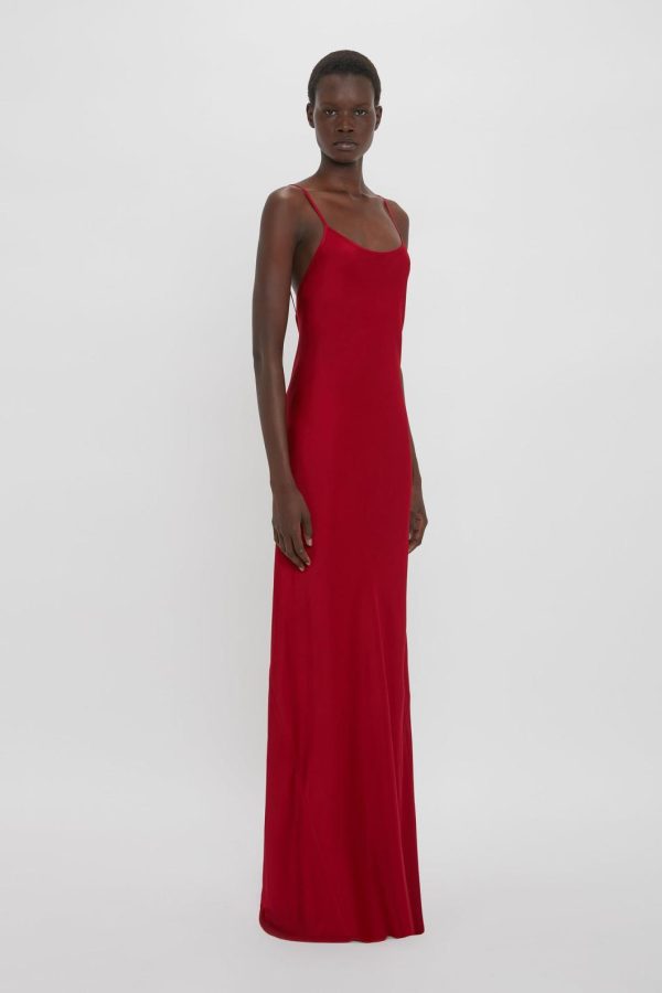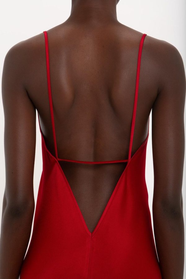 This stunning 1990s-inspired camisole-slip dress features a sophisticated bias cut that drapes beautifully on the body. The dramatic deep-V neckline and elegant scooped back create a captivating silhouette that commands attention, while delicate spaghetti straps add a touch of feminine allure. With its graceful floor-length hemline and vibrant Poppy Red hue, this dress delivers unforgettable sophistication for your most important occasions.